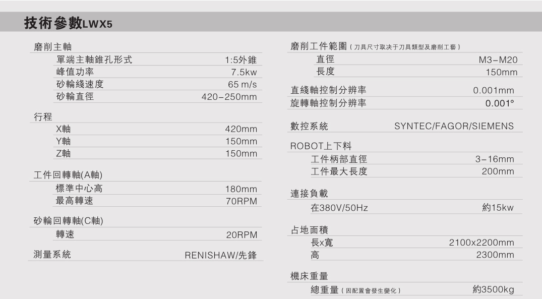 LWX5五軸數控螺紋磨床主要用于M0.8-M20絲錐直螺紋、錐螺紋及公、英制螺紋、擠壓絲錐螺紋的單線、多線高效精密磨削。