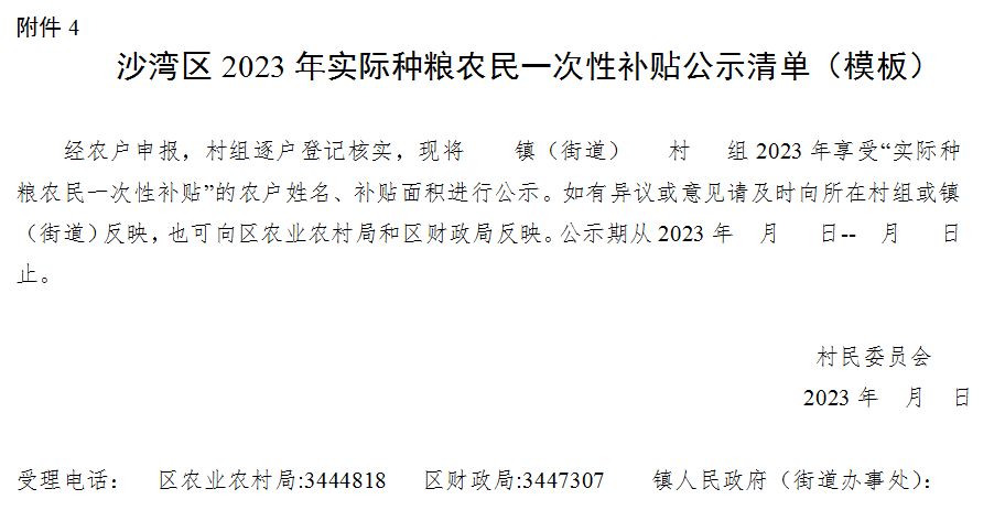 (二)補貼面積公示、核實。農戶信息、補貼面積申報登記完后,經村組干部審核后進行公示,按照統一公示模板格式(附件2、附件3、附件4),集中在各村委會或各組較集中地方進行為期不少于7天公示(上傳公示圖片)。公示期間,各鎮(街道)進行抽查復核,發現問題及時核實糾正。公示無異議后,各村將面積核查登記表(附件2、附件3)經農戶簽字確認后報送至各鎮(街道)。